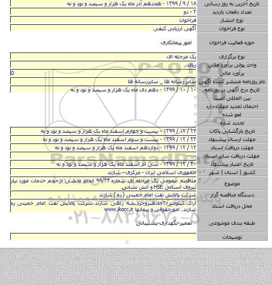 مناقصه عمومی یک مرحله ای شماره ۹۹/۳۴ انجام بخشی از حجم خدمات مورد نیاز نیروی انسانی HSE و آتش نشانی