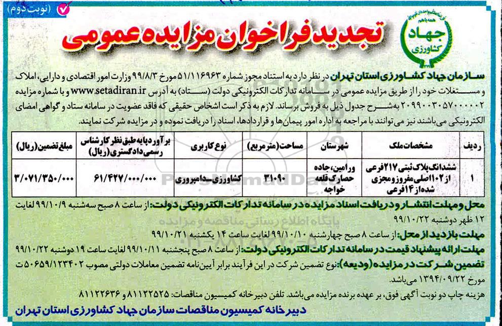 مزایده عمومی مزایده فروش ششدانگ پلاک ثبتی 217 فرعی تجدید نوبت دوم برگزار میگردد. از کلیه افراد متخصص و شرکتهای واجد شرایط دعوت به عمل میآید تا در این مزایده با کد خبرگزاری پارس نماد : 3021946 شرکت نمایند تاریخ شروع مزایده : 1399/10/10 مهلت شرکت در مزایده: تا پایان روز 1399/10/22 مکان برگزاری اموال واگذاری استانهای مزایدات استان تهران و دستهبندیهای مربوط به این حراجی املاک و زمین میباشد.