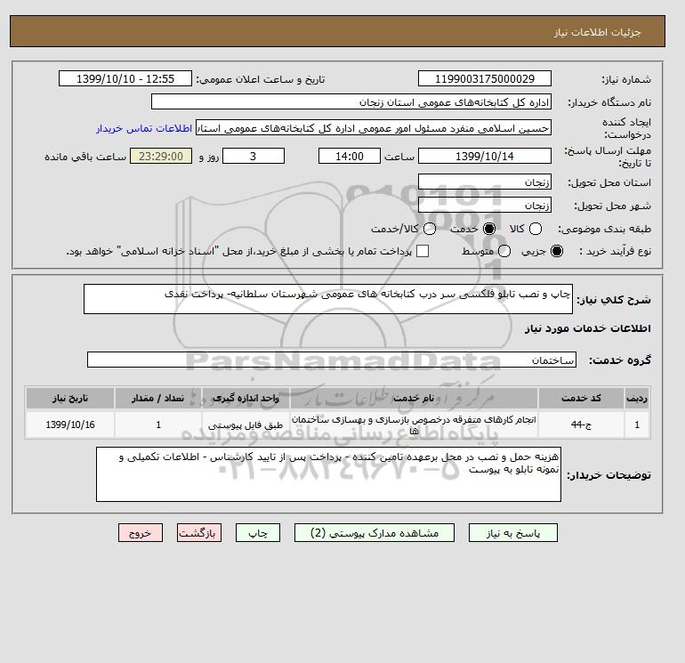 شرح کلی نیاز: چاپ و نصب تابلو فلکسی سر درب کتابخانه های عمومی شهرستان سلطانیه- پرداخت نقدی