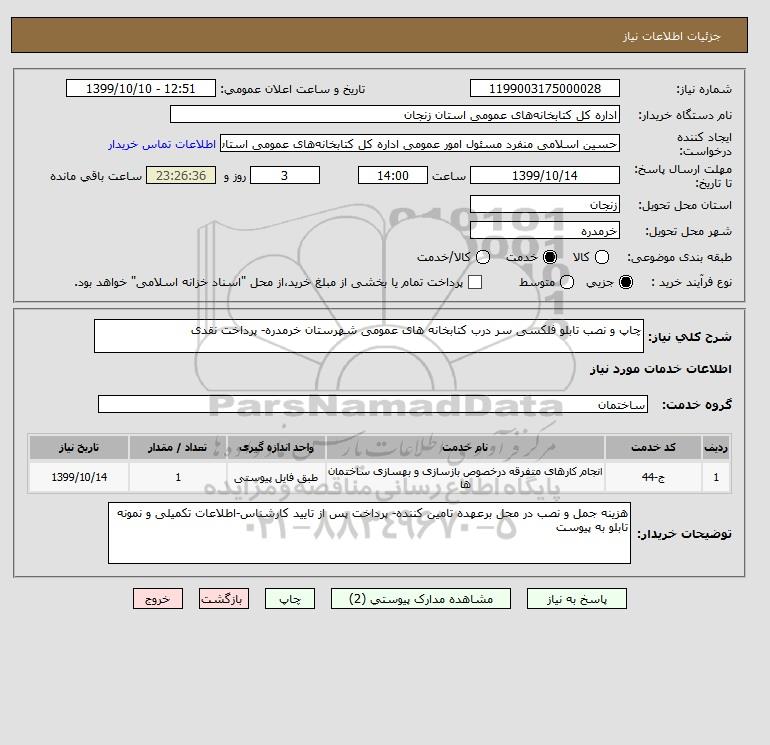 شرح کلی نیاز: چاپ و نصب تابلو فلکسی سر درب کتابخانه های عمومی شهرستان خرمدره- پرداخت نقدی