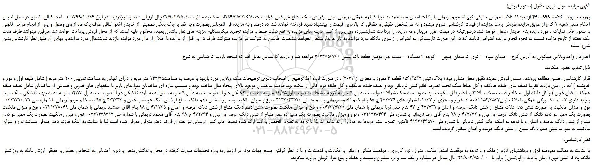بموجب پرونده کلاسه 4400999 ازشعبه12 دادگاه عمومی حقوقی کرج له مریم نریمانی با وکالت اسدی علیه جمشید-ثریا-فاطمه همگی نریمانی مبنی برفروش ملک مشاع غیر قابل افراز تحت پلاک156/3532لذا ملک به مبلغ 21/903/750/000ریال ارزیابی شده ومقررگردیده درتاریخ 1399/10/16 از ساعت 9 الی10صبح در محل اجرای احکام مدنی شعبه 1 کرج از طریق مزایده بفروش برسد .مزایده از قیمت کارشناسی شروع میشود و به هر شخص حقیقی و حقوقی که بالاترین قیمت را پیشنهاد نماید فروخته خواهد شد .ده درصد وجه مزایده فی المجلس بصورت وجه نقد یا چک بانکی تضمینی از خریدار اخذو الباقی ظرف یک ماه از وی وصول و پس از انجام مراحل قانونی و صدور حکم تملیک ، موردمزایده بنام خریدار منتقل خواهد شد. درصورتیکه در مهلت مقرر خریدار وجه مزایده را پرداخت ننمایدسپرده وی پس از کسر هزینه های مزایده به نفع دولت ضبط و مزایده تجدید میگردد.کلیه هزینه های نقل وانتقال بعهده محکوم علیه است. که از محل فروش پرداخت خواهد شد .طرفین میتوانند ظرف مدت یک هفته از تاریخ مزایده نسبت به نحوه انجام مزایده اعتراض نمایند که در این صورت تارسیدگی به اعتراض از سوی دادگاه مورد مزایده به نام خریدار منتقل نخواهد شد.ضمنا طالبین به شرکت در مزایده میتوانند ظرف 5 روز قبل از مزایده با اطلاع از مال مورد مزایده بازدید نمایند.مال مورد مزایده و بهای آن طبق نظر کارشناس بدین شرح است: