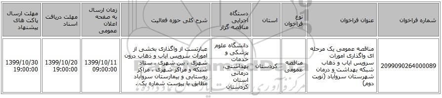 | 2099090264000089 | مناقصه عمومی یک مرحله ای واگذاری امورات سرویس ایاب و ذهاب شبکه بهداشت و درمان شهرستان سروآباد (نوبت دوم) | مناقصه عمومی | کردستان | دانشگاه علوم پزشکی و خدمات بهداشتی، درمانی استان کردستان | عبارتست از واگذاری بخشی از امورات سرویس ایاب و ذهاب درون شهری ، بین شهری ، ستاد شبکه و مراکز شهری ، مراکز روستایی و بیمارستان سروآباد مطابق با پیوست شماره یک . | 1399/10/11 09:00:00 | 1399/10/20 19:00:00 | 1399/10/30 19:00:00 |