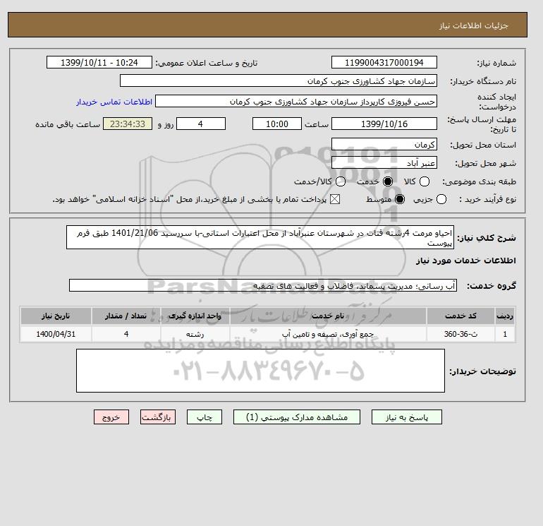 شرح کلی نیاز: احیاو مرمت 4رشته قنات در شهرستان عنبرآباد از محل اعتبارات استانی-با سررسید 1401/21/06 طبق فرم پیوست