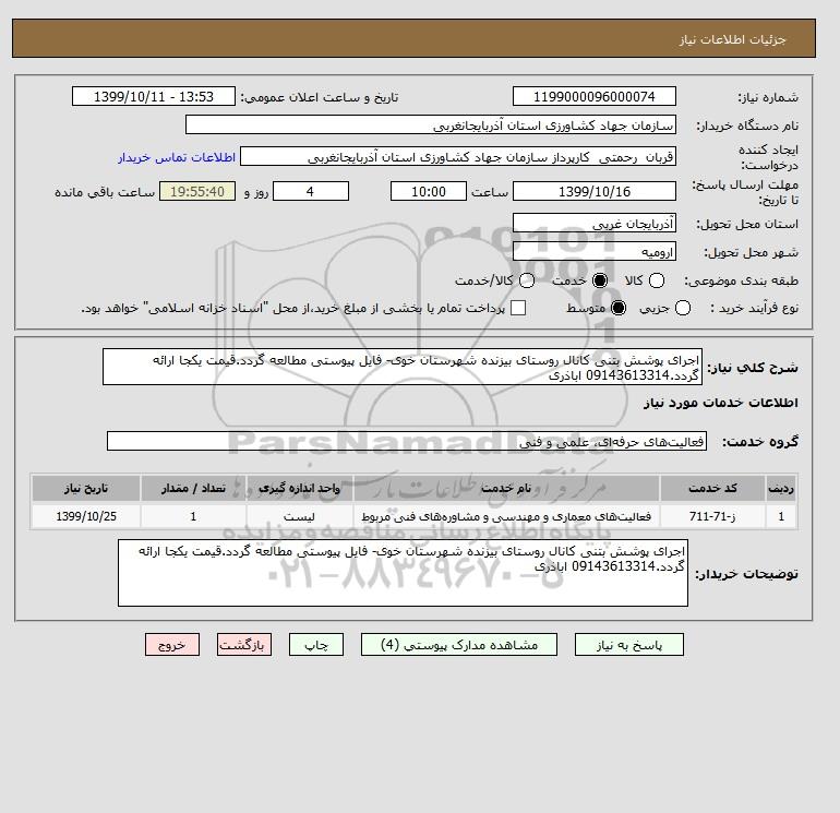 شرح کلی نیاز: اجرای پوشش بتنی کانال روستای بیزنده شهرستان خوی- فایل پیوستی مطالعه گردد.قیمت یکجا ارائه گردد.09143613314 اباذری