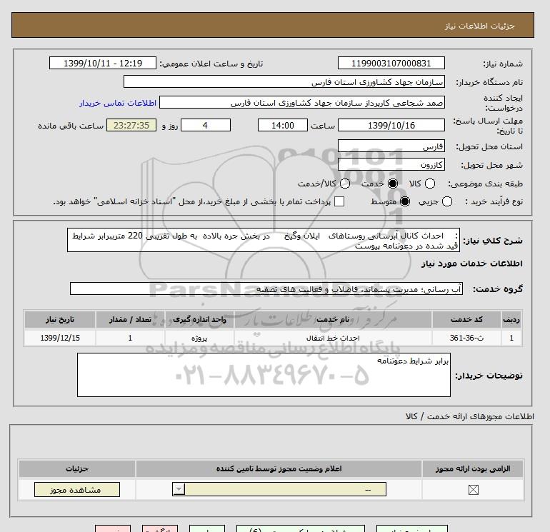شرح کلی نیاز: : احداث کانال آبرسانی روستاهای ایلان وگیخ در بخش جره بالاده به طول تقریبی 220 مترببرابر شرایط قید شده در دعوتنامه پیوست