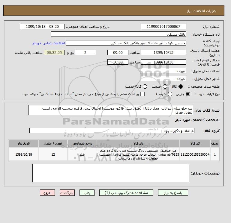 شرح کلی نیاز: میز جلو مبلی لیو تاب مدل TG35 (طبق پیش فاکتور پیوست) ارسال پیش فاکتور پیوست الزامی است تحویل فوری