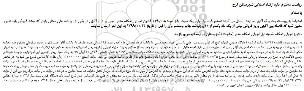 به موجب پرونده کلاسه983430 صادره از شعبه4 دادگاه عمومی خانواده کرج له: خانم پرستو میرزاجانی دارستانی فرزند محمدعیسی با وکالت فرهاد محبوبی علیه آقای حمیدرضا ابوترابی فرزند علیرضا با وکالت آقای حمید فکوری فرزند صفرعلی محکوم علیه محکوم است به پرداخت مهریه به میزان 50 عدد سکه تمام بهار آزادی و پرداخت هزینه دادرسی طبق تعرفه قانونی در حق محکوم لها و مبلغ پنج درصداز محکوم به بابت هزینه اجرایی با توجه به اینکه اجرائیه صادره به محکوم علیه ابلاغ شده ودر مهلت مقرر نسبت به اجرای حکم اقدام ننموده است بنا به در خواست محکوم له به منظور استیفای محکوم به وهزینه اجرایی اموال متعلق به محکوم علیه یک دستگاه خودرو سمند مدل1394 به شماره انتظامی 476ی43 ایران 99 به رنگ سفید روغنی ازسوی این اجراتوقیف وتوسط کارشناس رسمی دادگستری به شرح زیر توصیف وارزیابی شده ومقرر است در مورخ 1399/10/25 از ساعت 9 الی10 در محل اجرای احکام مجتمع خانواده از طریق مزایده بفروش می رسد، مزایده ازمبلغ 1120000000 ریال نظریه کارشناسی شروع می شود وبه هر شخص حقیقی وحقوقی که بالاترین قیمت را پیشنهاد نماید فروخته خواهد شد ده درصد وجه مزایده فی المجلس بصورت وجه نقد یا چک بانکی تضمینی از خریدار اخذ والباقی ظرف یک هفته از وی وصول خواهد شد وپس از انجام مراحل قانونی وصدور حکم تملیک مورد مزایده بنام خریدار منتقل خواهد شد در صورتیکه در مهلت مقرر خریدار وجه مزایده را پرداخت ننماید سپرده وی پس از کسر هزینه های مزایده به نفع دولت ضبط ومزایده تجدید می گرددکلیه هزینه های نقل وانتقال به عهده محکوم علیه است واز محل فروش پرداخت خواهد شد .طرفین می توانند ظرف یک هفته از تاریخ مزایده نسبت به نحوه انجام مزایده اعتراض نمایند که در این صورت تا رسیدگی به اعتراض از سوی دادگاه مورد مزایده به نام خریدار منتقل نخواهد شد ضمنا طالبین به شرکت در مزایده می توانند ظرف پنج روز قبل از مزایده با اطلاع این اجرا از مال مورد مزایده بازدید نمایند چنانچه روز مزایده مصادف با ایام تعطیل باشد روز بعد در همان ساعت ومکان برگزار خواهد شد . مال مورد مزایده وبهای آن طبق نظر کارشناس بدین شرح است: یک دستگاه خودرو سمند مدل1394 به شماره انتظامی 476ی43 ایران 99 به رنگ سفید روغنی می باشد. درب عقب راست و سپر عقب نیاز به صافکاری و نقاشی دارد. خودرو در پارکینگ سبلان جاده مخصوص می باشد. با این تفاسیر قیمت مدل مشابه در بازار فعلی و مدل 1394 و وضعیت ظاهری سواری سمند 1120000000 ریال معادل یکصد و دوازده میلیون تومان تعیین می گردد./