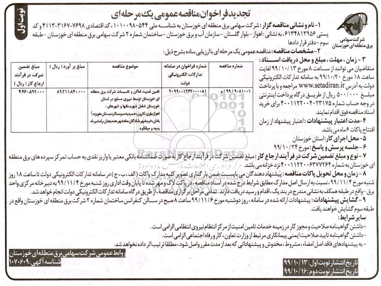 99/9081001/م 2099001262000081 تامین امنیت اماکن و تاسیسات شرکت برق منطقه ای خوزستان توسط نیروهای مسلح در استان خوزستان شامل شهرستان های و شهرهای اهواز ، باوی ، کارون ، حمیدیه ، سوسنگرد ، بستان ، هویزه ، آبادان ، خرمشهر ، شادگان ، ماهشهر ، هندیجان ، رامشیر ، امیدیه و میانکوه  89.211.840.000 4.460.592.000