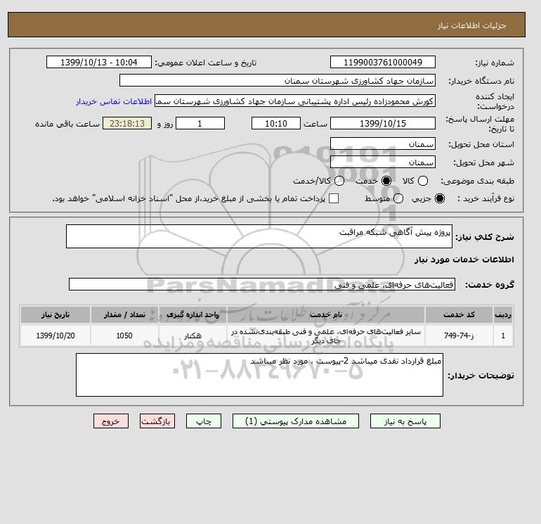 استعلام بها و موضوع استعلام استعلام پروژه پیش آگاهی شبکه مراقبت به اطلاع کلیه شرکتها و افراد متخصص واجد شرایط میرساند، آگهی گذار در نظر دارد از طریق استعلام بها، نسبت به انتخاب و دریافت پیشنهادات اقدام نماید. این استعلام با کد آگهی ثبت شده در سامانه خبرگزاری پارس نماد : 3028460 منتشر شده است. مشخصات استعلام : تاریخ شروع استعلام: 1399/10/13 آخرین مهلت ارسال پیشنهاد قیمت : 1399/10/14 و محل اجرای پروژه : استان مناقصات استان سمنان میباشد. استعلام قیمت مورد درخواست : استعلام پروژه پیش آگاهی شبکه مراقبت با دستهبندیهای تخصصی و گروه های مرتبط : تجهیزات و خدمات کشاورزی و دامپروری, استعلام اطلاع رسانی میگردد.