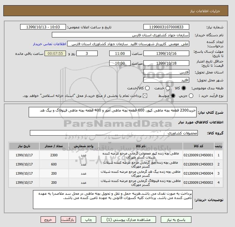 شرح کلی نیاز: خرید2300 قطعه بچه ماهی کپور، 600 قطعه بچه ماهی آمور و 400 قطعه بچه ماهی فیتوفاگ و بیگ هد