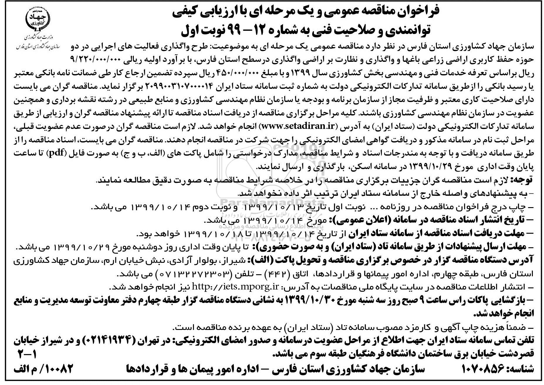 به موضوعیت: طرح واگذاری فعالیت های اجرایی در دو حوزه حفظ کاربری اراضی زراعی و باغها و واگذاری و نظارت بر اراضی واگذاری در سطح استان فارس با برآورد اولیه ریالی 9.220.000.000 ریال براساس تعرفه خدمات فنی و مهندسی بخش کشاورزی سال 99 و با مبغ 450.000.000 ریال سپرده تضمین ارجاع کار طی ضمانت نامه بانکی معتبر یا رسید بانکی را از طریق سامانه تدارکتت الکترونیکی دولت به شماره ثبت سامانه ستاد ایران 2099003107000014 برگزر نماید مناقصه گران می بایست دارای صلاحیت کاری معتبر و ظرفیت مجاز از سازمان برنامه و بودجه یا سازمان نظام مهندسی کشاورزی و منابع طبیعی در شته نقشه برداری و همچنین عضویت در سازمان نظام مهندسی کشاورزی باشند کلیه مراحل برگزاری مناقصه از دریافت اسناد مناقصه تا ارائه پیشنهاد مناقصه گران و ارزیابی از طریق سامانه تدارکات الکترونیکی دولت ستاد