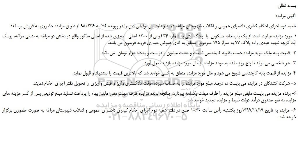 6- مزایده به تاریخ 1399/11/19روز یکشنبه رأس ساعت 10:30 صبح در دفتر شعبه دوم اجرای احکام کیفری دادسرای عمومی و انقلاب شهرستان مراغه به صورت حضوری برگزار خواهد شد.