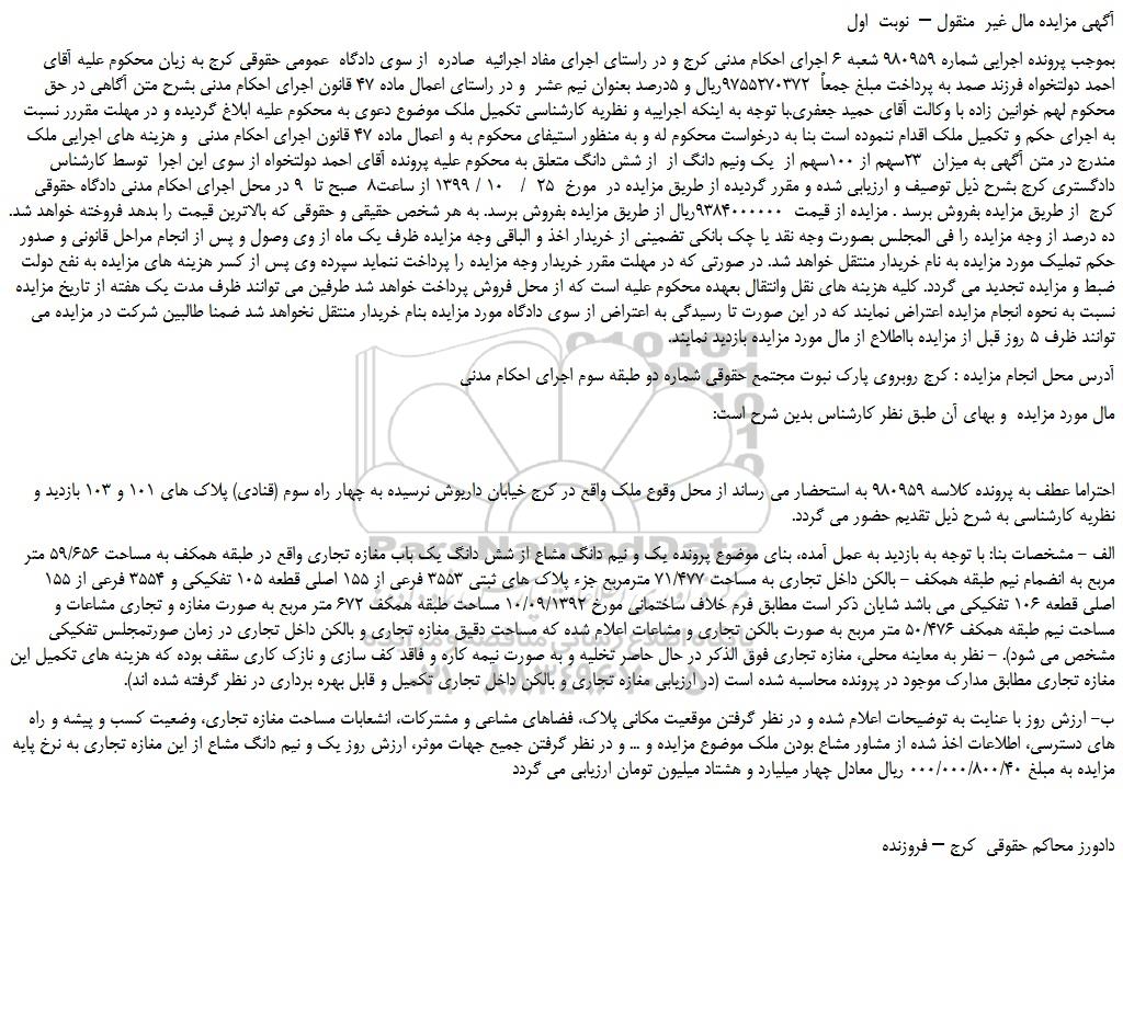 بموجب پرونده اجرایی شماره 980959 شعبه 6 اجرای احکام مدنی کرج و در راستای اجرای مفاد اجرائیه  صادره  از سوی دادگاه  عمومی حقوقی کرج به زیان محکوم علیه آقای احمد دولتخواه فرزند صمد به پرداخت مبلغ جمعاً  9755270372ریال و 5درصد بعنوان نیم عشر  و در راستای اعمال ماده 47 قانون اجرای احکام مدنی بشرح متن آگاهی در حق محکوم لهم خوانین زاده با وکالت آقای حمید جعفری.با توجه به اینکه اجراییه و نظریه کارشناسی تکمیل ملک موضوع دعوی به محکوم علیه ابلاغ گردیده و در مهلت مقررر نسبت به اجرای حکم و تکمیل ملک اقدام ننموده است بنا به درخواست محکوم له و به منظور استیفای محکوم به و اعمال ماده 47 قانون اجرای احکام مدنی  و هزینه های اجرایی ملک مندرج در متن آگهی به میزان  23سهم از 100سهم از  یک ونیم دانگ از  از شش دانگ متعلق به محکوم علیه پرونده آقای احمد دولتخواه از سوی این اجرا  توسط کارشناس دادگستری کرج بشرح ذیل توصیف و ارزیابی شده و مقرر گردیده از طریق مزایده در  مورخ  25  /   10 / 1399 از ساعت8  صبح تا  9 در محل اجرای احکام مدنی دادگاه حقوقی کرج  از طریق مزایده بفروش برسد . مزایده از قیمت  9384000000ریال از طریق مزایده بفروش برسد. به هر شخص حقیقی و حقوقی که بالاترین قیمت را بدهد فروخته خواهد شد. ده درصد از وجه مزایده را فی المجلس بصورت وجه نقد یا چک بانکی تضمینی از خریدار اخذ و الباقی وجه مزایده ظرف یک ماه از وی وصول و پس از انجام مراحل قانونی و صدور حکم تملیک مورد مزایده به نام خریدار منتقل خواهد شد. در صورتی که در مهلت مقرر خریدار وجه مزایده را پرداخت ننماید سپرده وی پس از کسر هزینه های مزایده به نفع دولت ضبط و مزایده تجدید می گردد. کلیه هزینه های نقل وانتقال بعهده محکوم علیه است که از محل فروش پرداخت خواهد شد طرفین می توانند ظرف مدت یک هفته از تاریخ مزایده نسبت به نحوه انجام مزایده اعتراض نمایند که در این صورت تا رسیدگی به اعتراض از سوی دادگاه مورد مزایده بنام خریدار منتقل نخواهد شد ضمنا طالبین شرکت در مزایده می توانند ظرف 5 روز قبل از مزایده بااطلاع از مال مورد مزایده بازدید نمایند.