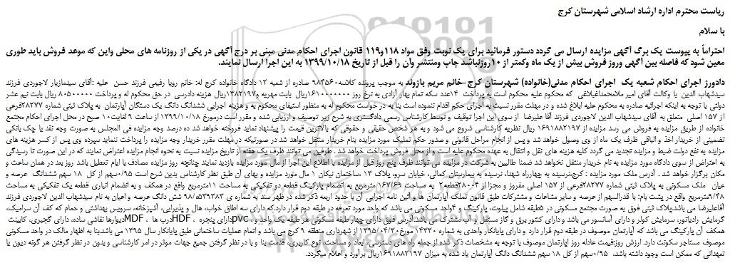 احتراماً به پیوست یک برگ آگهی مزایده ارسال می گردد دستور فرمائید برای یک نوبت وفق مواد 118و119 قانون اجرای احکام مدنی مبنی بر درج آگهی در یکی از روزنامه های محلی واین که موعد فروش باید طوری معین شود که فاصله بین آگهی وروز فروش بیش از یک ماه وکمتر از 10روزنباشد چاپ ومنتشر وآن را قبل از تاریخ 1399/10/18 به این اجرا ارسال نمایند.