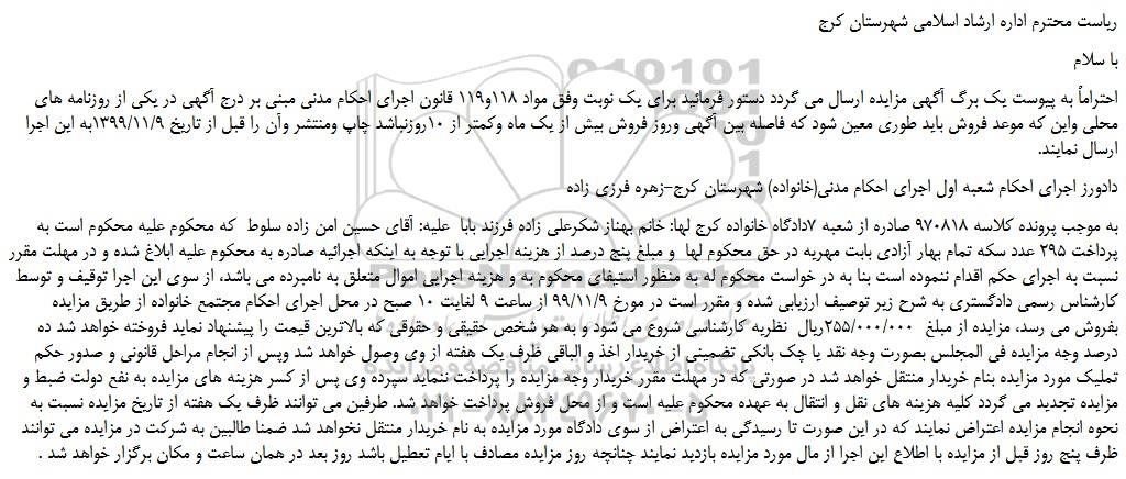 به موجب پرونده کلاسه 970818 صادره از شعبه 7دادگاه خانواده کرج لها: خانم بهناز شکرعلی زاده فرزند بابا علیه: آقای حسین امن زاده سلوط که محکوم علیه محکوم است به پرداخت 295 عدد سکه تمام بهار آزادی بابت مهریه در حق محکوم لها و مبلغ پنج درصد از هزینه اجرایی با توجه به اینکه اجرائیه صادره به محکوم علیه ابلاغ شده و در مهلت مقرر نسبت به اجرای حکم اقدام ننموده است بنا به در خواست محکوم له به منظور استیفای محکوم به و هزینه اجرایی اموال متعلق به نامبرده می باشد، از سوی این اجرا توقیف و توسط کارشناس رسمی دادگستری به شرح زیر توصیف ارزیابی شده و مقرر است در مورخ 99/11/9 از ساعت 9 لغایت 10 صبح در محل اجرای احکام مجتمع خانواده از طریق مزایده بفروش می رسد، مزایده از مبلغ 255/000/000ریال نظریه کارشناسی شروع می شود و به هر شخص حقیقی و حقوقی که بالاترین قیمت را پیشنهاد نماید فروخته خواهد شد ده درصد وجه مزایده فی المجلس بصورت وجه نقد یا چک بانکی تضمینی از خریدار اخذ و الباقی ظرف یک هفته از وی وصول خواهد شد وپس از انجام مراحل قانونی و صدور حکم تملیک مورد مزایده بنام خریدار منتقل خواهد شد در صورتی که در مهلت مقرر خریدار وجه مزایده را پرداخت ننماید سپرده وی پس از کسر هزینه های مزایده به نفع دولت ضبط و مزایده تجدید می گردد کلیه هزینه های نقل و انتقال به عهده محکوم علیه است و از محل فروش پرداخت خواهد شد. طرفین می توانند ظرف یک هفته از تاریخ مزایده نسبت به نحوه انجام مزایده اعتراض نمایند که در این صورت تا رسیدگی به اعتراض از سوی دادگاه مورد مزایده به نام خریدار منتقل نخواهد شد ضمنا طالبین به شرکت در مزایده می توانند ظرف پنج روز قبل از مزایده با اطلاع این اجرا از مال مورد مزایده بازدید نمایند چنانچه روز مزایده مصادف با ایام تعطیل باشد روز بعد در همان ساعت و مکان برگزار خواهد شد .