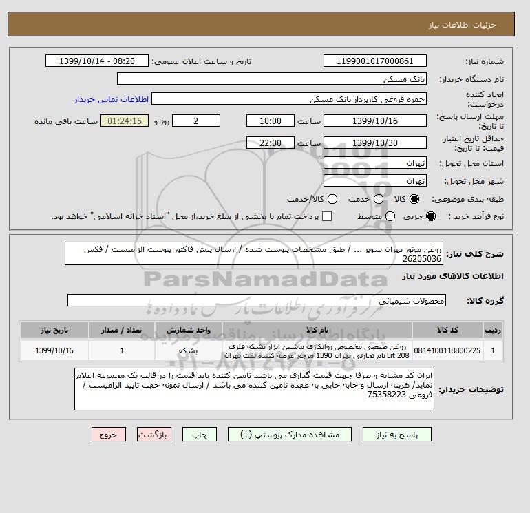 شرح کلی نیاز: روغن موتور بهران سوپر ... / طبق مشخصات پیوست شده / ارسال پیش فاکتور پیوست الزامیست / فکس 26205036