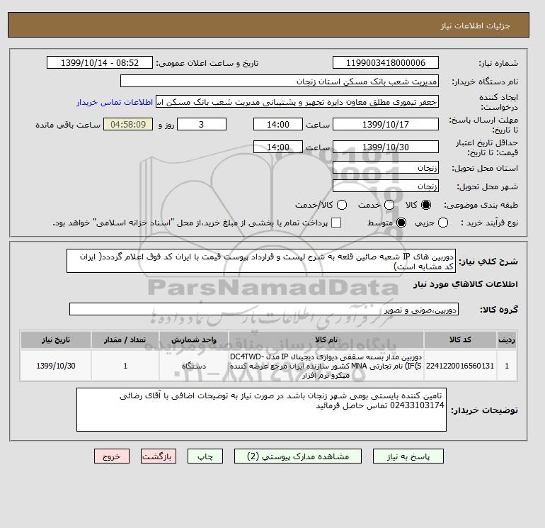 شرح کلی نیاز: دوربین های IP شعبه صائین قلعه به شرح لیست و قرارداد پیوست قیمت با ایران کد فوق اعلام گرددد( ایران کد مشابه است)