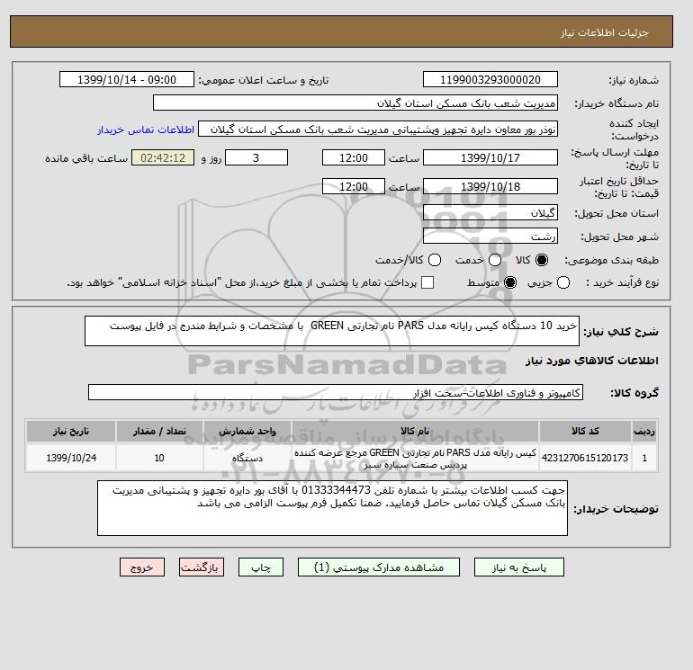 شرح کلی نیاز: خرید 10 دستگاه کیس رایانه مدل PARS نام تجارتی GREEN با مشخصات و شرایط مندرج در فایل پیوست