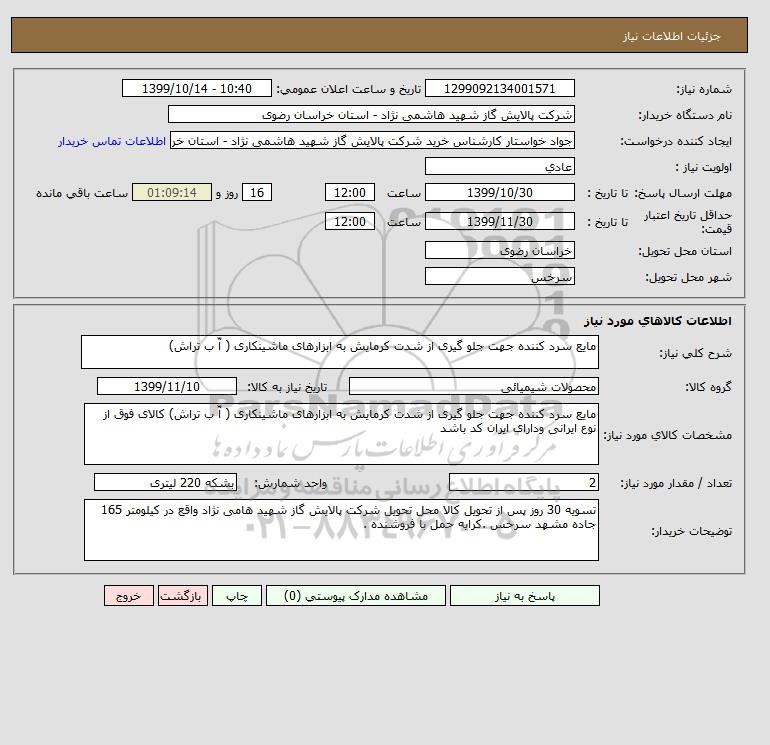 نام دستگاه خریدار:شرکت پالایش گاز شهید هاشمی نژاد - استان خراسان رضوی
