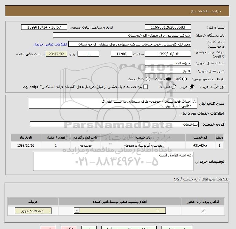 شرح کلی نیاز: احداث فونداسیون و حوضچه های سیمانی در پست اهواز 2