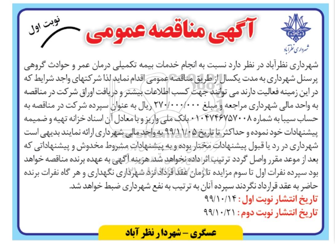 شهرداری نظرآباد در نظر دارد نسبت به انجام خدمات بیمه تکمیلی درمان عمر و حوادث گروهی پرسنل شهرداری به مدت یک سال از طریق مناقصه عمومی اقدام نماید لذا شرکت های  واجد شرایط ه در این زمینه فعالیت دارند می توانند جهت کسب اطلاعات بیشتر و دریافت اوراق شرکت در مناقصه به واحد مالی شهرداری مراجعه و مبلغ 270.000.000 ریال به عنوان سپرده شرکت در مناقصه به حساب سیبا به شماره 0104746757008 بانک ملی واریز و با معادل آن اسناد خزانه تهیه و ضمیمه پیشنهادات خود نموده و حداکثر تا تاریخ 99.11.5 به واحد مالی شهرداری ارائه نمایند بدیهی است شهرداری در رد یا قبول پیشنهادات مختار بوده و به پیشنهادات مشروط مخدوش و پیشنهاداتی که بعد از موعد مقرر واصل گردد ترتیب اثر داده نخواهد شد هزینه آگهی به عهده برنده مناقصه خواهد بود سپرده نفرات اول تا سوم مزایده تا زمان عقد قرارداد نزد شهرداری نگهداری و هر گاه نفرات برند حاضر به عقد قرارداد نگردند سپرده آنان به ترتیب به نفع شهرداری ضبط خواهد شد