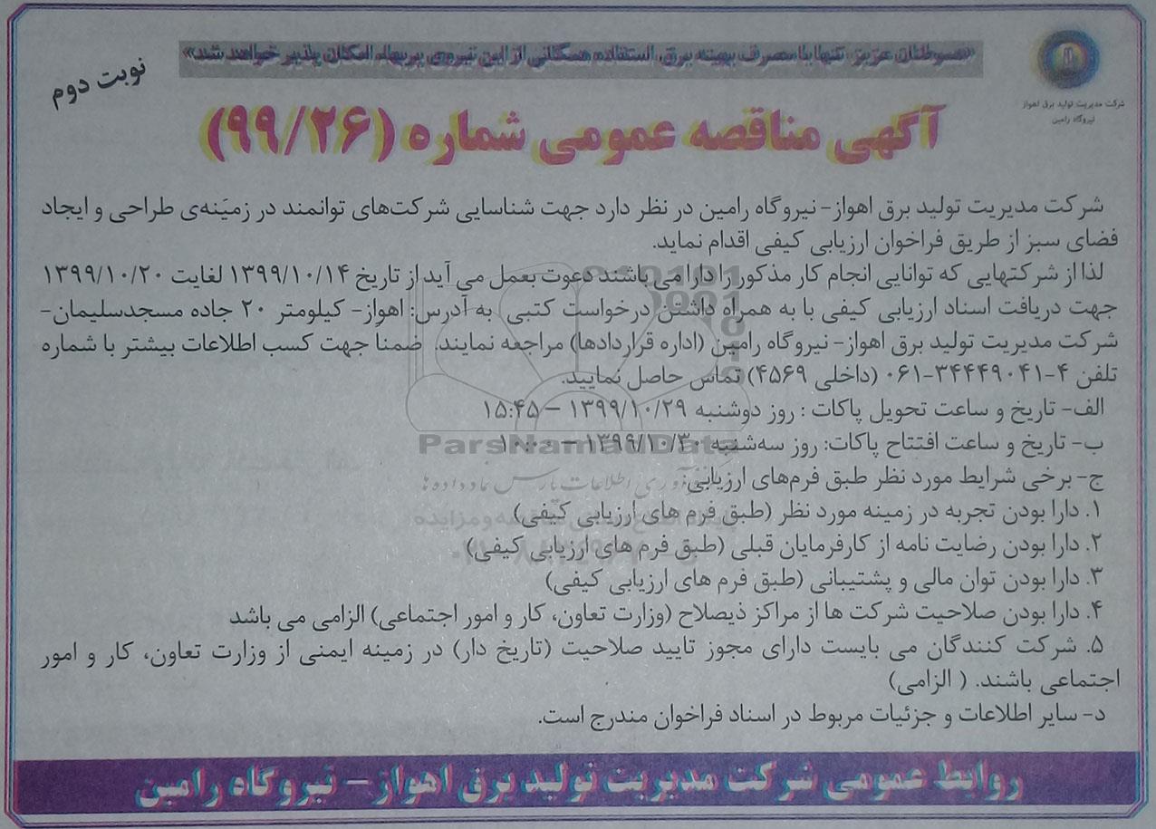 شرکت مدیریت تولید برق اهواز - نیروگاه رامین در نظر دارد جهت شناسایی شرکتهای توانمند در زمینه طراحی و ایجاد فضای سبز از طریق فراخوان ارزیابی کیفی اقدام نمایند.
