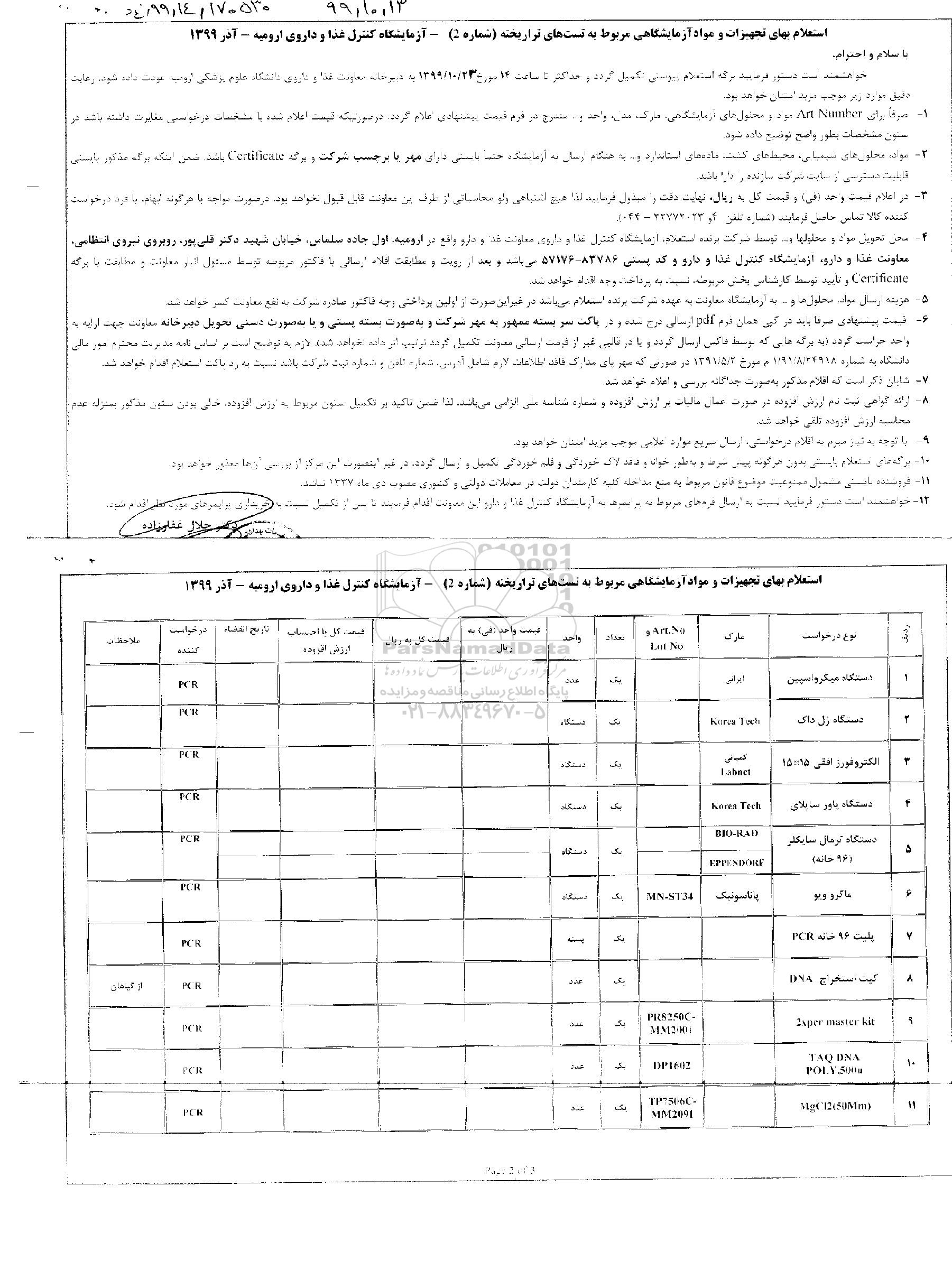 استعلام بهای تجهیزات و مواد آزمایشگاهی مربوط به تست های تراریخته (شماره 2- آزمایشگاه کنترل غذا و داروی ارومیه - آذر 1399