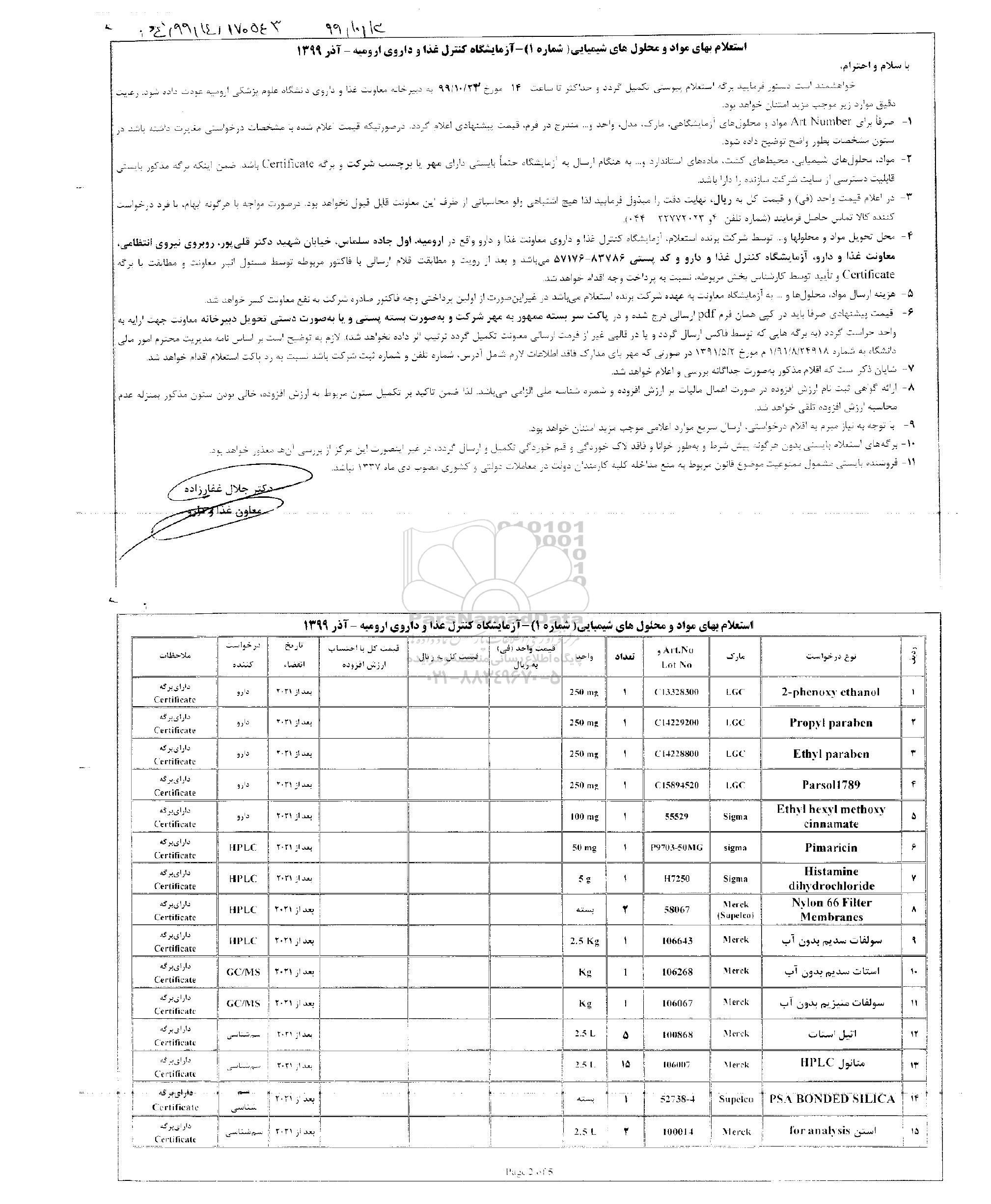استعلام بهای مواد و محلول های شیمیایی (شماره 1) - آزمایشگاه کنترل غذا و داروی ارومیه  - آذر 1399
