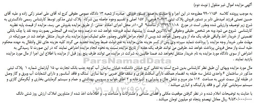 به موجب پرونده کلاسه 9901156 مطروحه در این اجرا و با عنایت به صدور دستور فروش صادره از شعبه 13 دادگاه عمومی حقوقی کرج له آقای علی اصغر زکی زاده و علیه آقای حسین نعمتی فرزند امیدعلی دابر بر دستور فروش پلاک ثبتی 20272 فرعی از 157 اصلی و تقسیم وجوه حاصله بین شرکاء پلاک ثبتی مذکور توسط کارشناس رسمی دادگستری به شرح زیر توصیف وارزیابی شده ومقرر است در مورخ 1399/11/08 از ساعت9 الی10در محل اجرای احکام مدنی از طریق مزایده بفروش می رسد، مزایده از قیمت پایه نظریه کارشناسی شروع می شود وبه هر شخص حقیقی وحقوقی که بالاترین قیمت را پیشنهاد نماید فروخته خواهد شد ده درصد وجه مزایده فی المجلس بصورت وجه نقد یا چک بانکی تضمینی از خریدار اخذ والباقی ظرف یک ماه از وی وصول خواهد شد وپس از انجام مراحل قانونی وصدور حکم تملیک مورد مزایده بنام خریدار منتقل خواهد شد در صورتیکه در مهلت مقرر خریدار وجه مزایده را پرداخت ننماید سپرده وی پس از کسر هزینه های مزایده به نفع دولت ضبط ومزایده تجدید می گردد کلیه هزینه های نقل وانتقال به عهده محکوم علیه است واز محل فروش پرداخت خواهد شد .طرفین می توانند ظرف یک هفته از تاریخ مزایده نسبت به نحوه انجام مزایده اعتراض نمایند که در این صورت تا رسیدگی به اعتراض از سوی دادگاه مورد مزایده به نام خریدار منتقل نخواهد شد ضمنا طالبین به شرکت در مزایده می توانند ظرف پنج روز قبل از مزایده با اطلاع این اجرا از مال مورد مزایده بازدید نمایند .