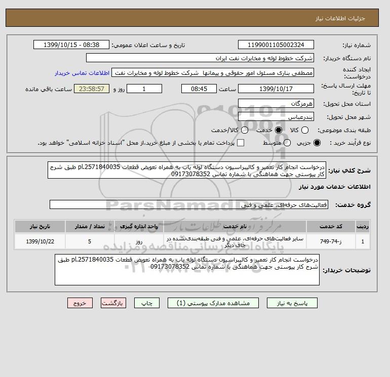 شرح کلی نیاز: درخواست انجام کار تعمیر و کالیبراسیون دستگاه لوله یاب به همراه تعویض قطعات pl.2571840035 طبق شرح کار پیوستی جهت هماهنگی با شماره تماس 09173078352