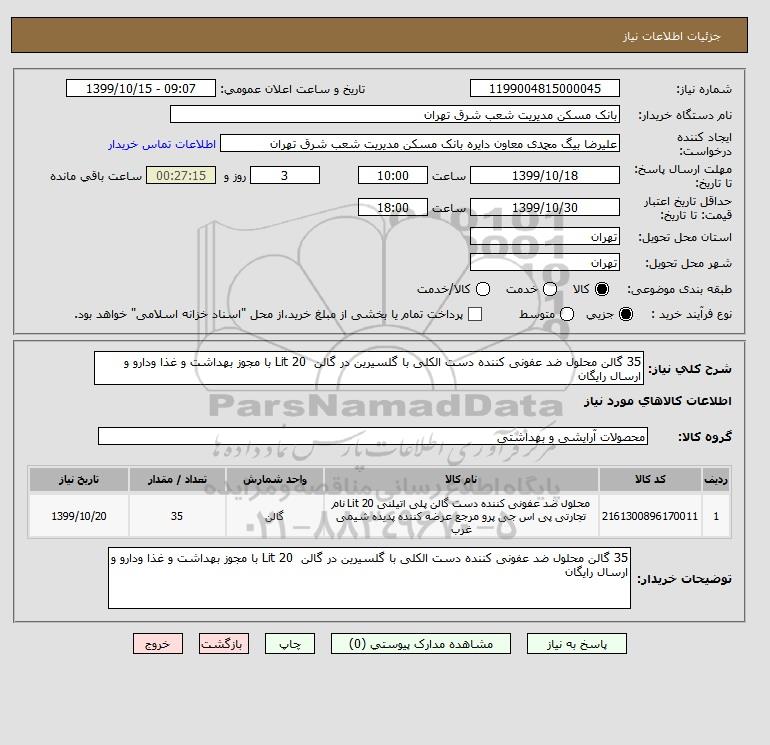 استعلام 35 گالن محلول ضد عفونی کننده دست الکلی با گلسیرین در گالن 20 Lit با مجوز بهداشت و غذا ودارو و ارسال رایگان, استعلام 35 گالن محلول ضد عفونی کننده دست الکلی با گلسیرین در گالن 20 Lit با مجوز بهداشت و غذا ودارو و ارسال رایگان