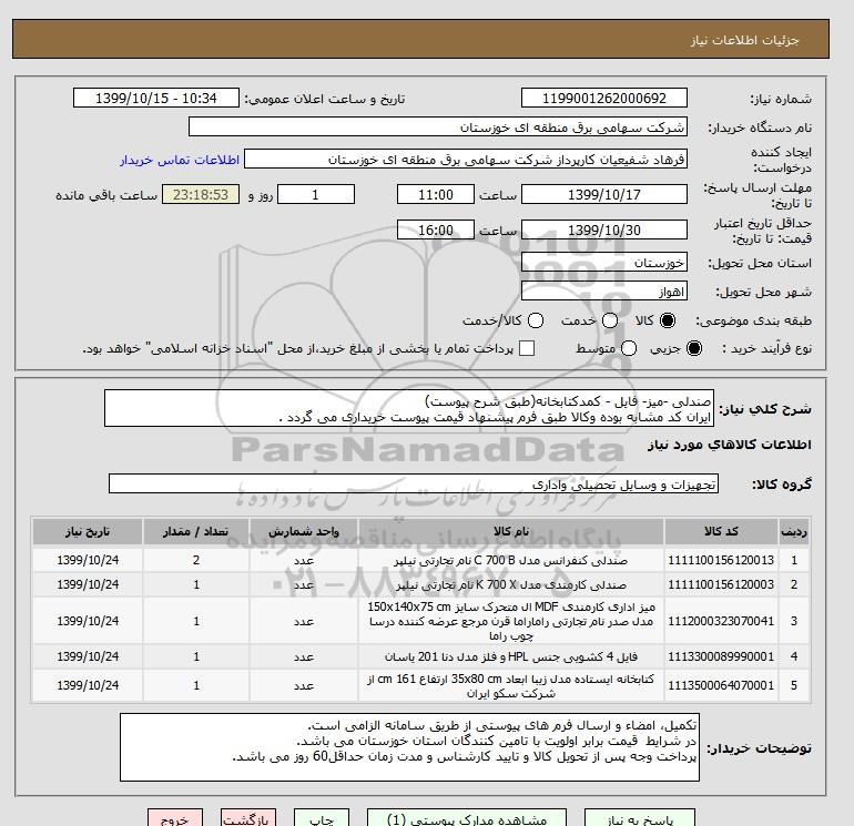 شرح کلی نیاز: صندلی -میز- فایل - کمدکتابخانه(طبق شرح پیوست)