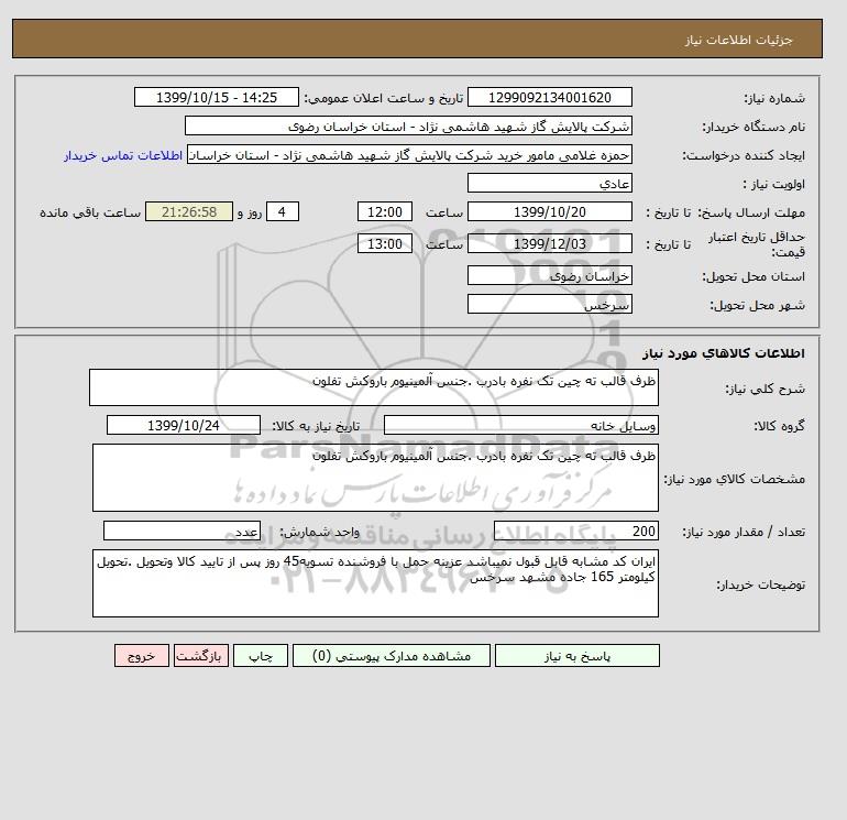 نام دستگاه خریدار:شرکت پالایش گاز شهید هاشمی نژاد - استان خراسان رضوی