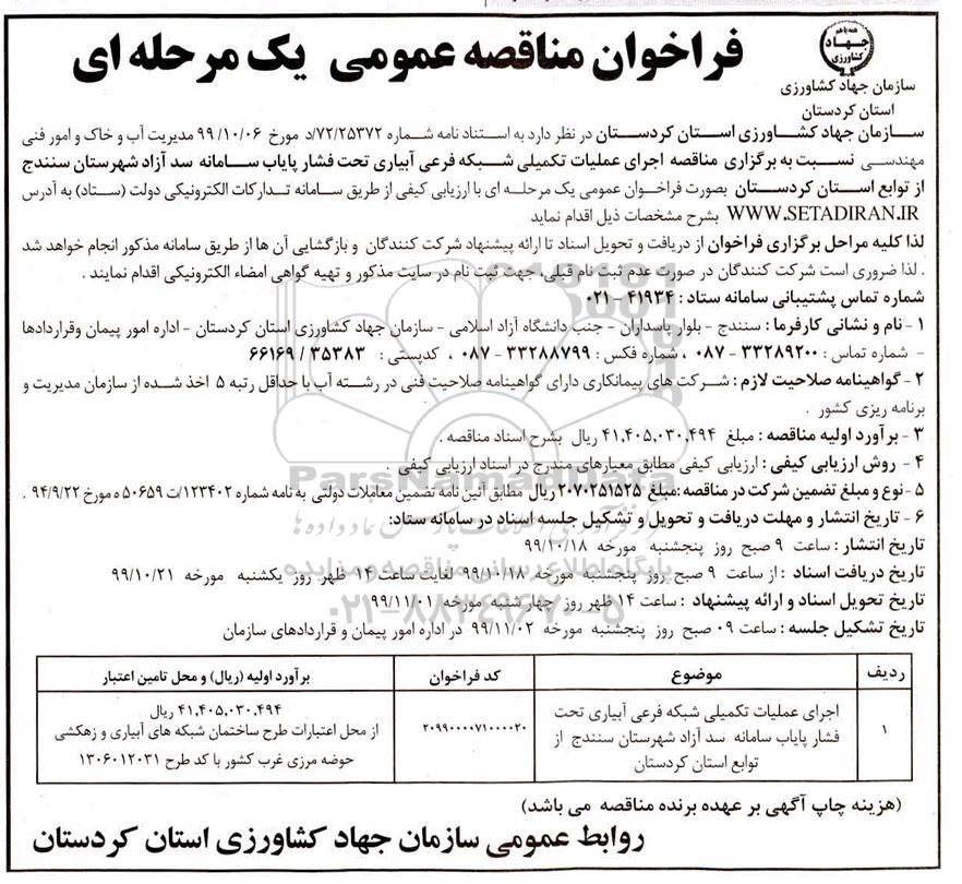 سازمان جهاد کشاورزی استان کردستان در نظر دارد نسبت به برگزاری مناقصه اجرای عملیات تکمیلی شبکه فرعی آبیاری تحت فشار پایاب سامانه سد آزاد شهرستان سنندج از توابع استان کردستان به صورت فراخوان عمومی یک مرحله ای با ارزیابی کیفی از طریق سامانه تدارکات الکترونیکی دولت ستاد به شرح مشخصات ذیل