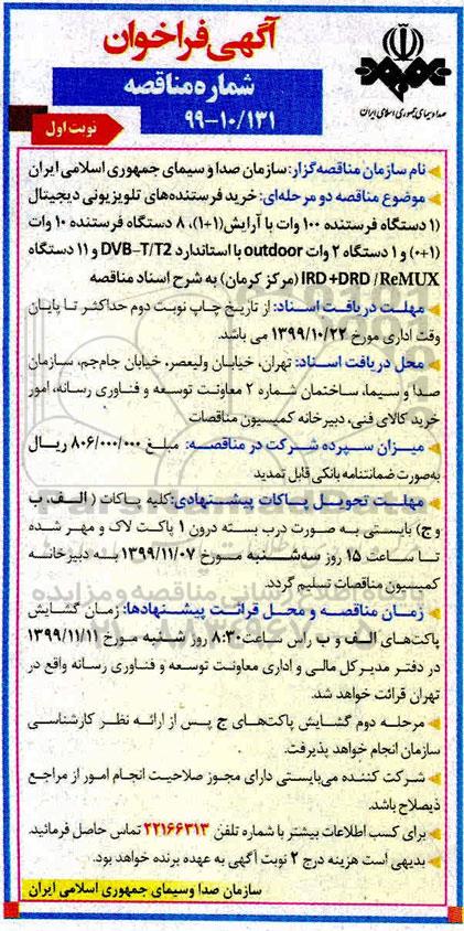 - موضوع مناقصه دو مرحله ای: خرید فرستنده های تلویزیونی دیجیتال (1 دستگاه فرستنده 100 وات با آرایش (1+1)، 8 دستگاه فرستنده 10 وات (1+0) و 1 دستگاه 2 وات outdoor با استاندارد T/T2-DVB و 11 دستگاه ReMUX / IRD+DRD (مرکز کرمان) به شرح اسناد مناقصه