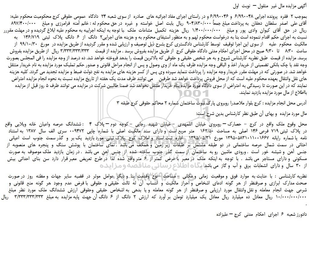 بموجب 2 فقره پرونده اجرایی 6/990048 و 6/990046 و در راستای اجرای مفاد اجرائیه های صادره از سوی شعبه 24 دادگاه عمومی حقوقی کرج محکومیت محکوم علیه: آقای علی اصغر سلطان دهقان به پرداخت مبلغ جمعاً 904/830/000 ریال بابت اصل خواسته و غیره در حق محکوم له : خانم آمنه فرامرزی و مبلغ 897/400/000 ریال در حق آقای کیوان وادی پور و مبلغ 1/400/000/000 ریال هزینه تکمیل مشاعات ملک .با توجه به اینکه اجراییه به محکوم علیه ابلاغ گردیده و در مهلت مقررر نسبت به اجرای حکم اقدام ننموده است بنا به درخواست محکوم لهم و به منظور استیفای محکوم به و هزینه های اجرایی2 دانگ از 6 دانگ پلاک ثبتی 146/719 به مالکیت محکوم علیه از سوی این اجرا توقیف توسط کارشناس دادگستری کرج بشرح ذیل توصیف و ارزیابی شده و مقرر گردیده از طریق مزایده در مورخ 99/10/30 از ساعت 8:30 تا 9:30 صبح در محل اجرای احکام مدنی دادگاه حقوقی کرج از طریق مزایده بفروش برسد . مزایده از قیمت 3/333/333/333 ریال از طریق مزایده بفروش برسد. مزایده از قیمت طبق نظریه کارشناس شروع و به هر شخص حقیقی و حقوقی که بالاترین قیمت را بدهد فروخته خواهد شد. ده درصد از وجه مزایده را فی المجلس بصورت وجه نقد یا چک بانکی تضمینی از خریدار اخذ و الباقی وجه مزایده ظرف یک ماه از وی وصول و پس از انجام مراحل قانونی و صدور حکم تملیک مورد مزایده به نام خریدار منتقل خواهد شد. در صورتی که در مهلت مقرر خریدار وجه مزایده را پرداخت ننماید سپرده وی پس از کسر هزینه های مزایده به نفع دولت ضبط و مزایده تجدید می گردد. کلیه هزینه های نقل وانتقال بعهده محکوم علیه است که از محل فروش پرداخت خواهد شد طرفین می توانند ظرف مدت یک هفته از تاریخ مزایده نسبت به نحوه انجام مزایده اعتراض نمایند که در این صورت تا رسیدگی به اعتراض از سوی دادگاه مورد مزایده بنام خریدار منتقل نخواهد شد ضمنا طالبین شرکت در مزایده می توانند ظرف 5 روز قبل از مزایده بااطلاع از مال مورد مزایده بازدید نمایند.
