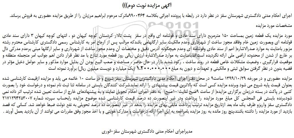 اجرای احکام مدنی دادگستری شهرستان سقز در نظر دارد در رابطه با پرونده اجرائی بکلاسه 9900464ماترک مرحوم ابراهیم مرزبان را از طریق مزایده حضوری به فروش برساند.