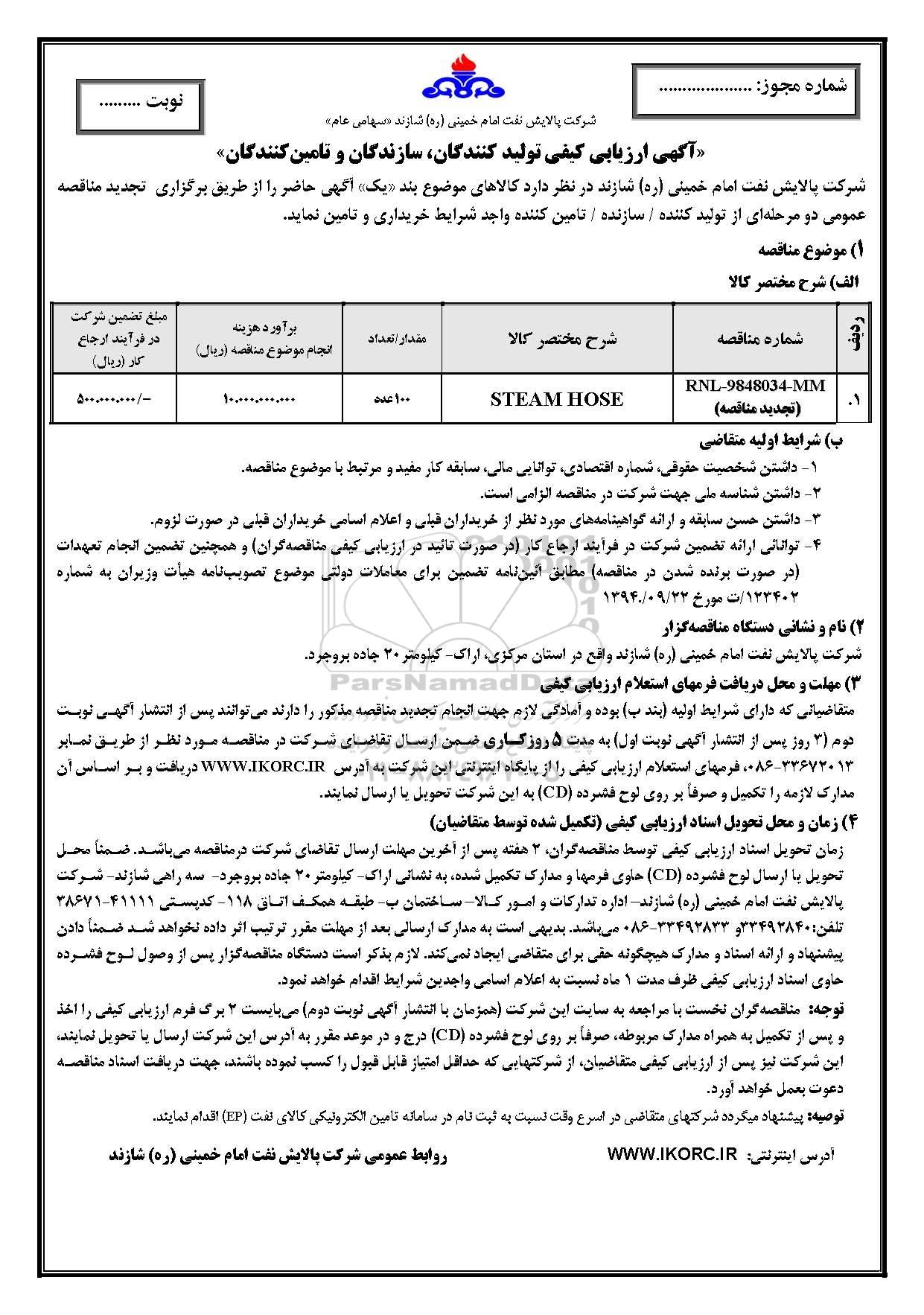 ارزیابی کیفی STEAM HOSE از کلیه افراد متخصص و شرکتها واجد شرایط دعوت به عمل میآید در مناقصه با کد خبرگزاری پارس نماد: 3041219 شرکت نمایند.