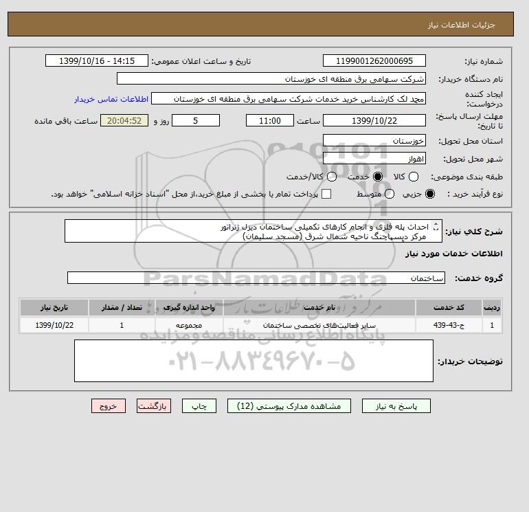 شرح کلی نیاز: احداث پله فلزی و انجام کارهای تکمیلی ساختمان دیزل ژنراتور مرکز دیسپاچنگ ناحیه شمال شرق (مسجد سلیمان) مطابق آنالیز پیوست