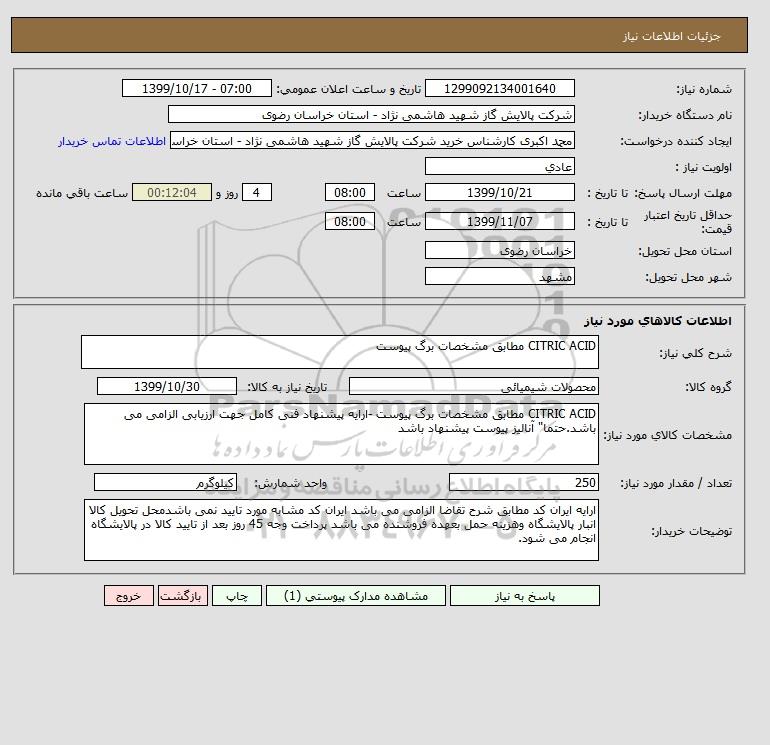 نام دستگاه خریدار:شرکت پالایش گاز شهید هاشمی نژاد - استان خراسان رضوی