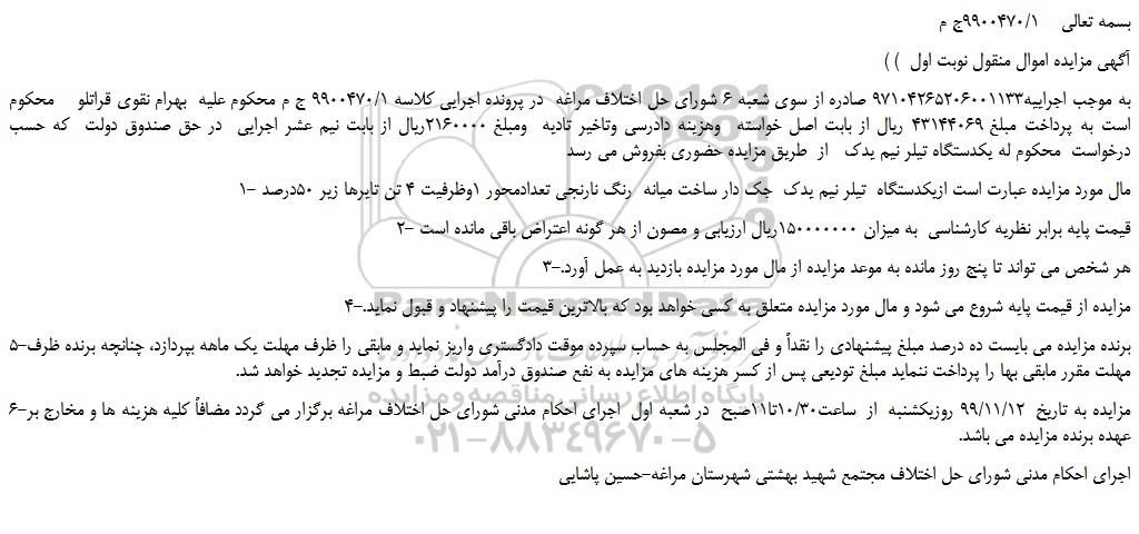 به موجب اجراییه97104265206001133 صادره از سوی شعبه 6 شورای حل اختلاف مراغه  در پرونده اجرایی کلاسه 9900470/1 ج م محکوم علیه  بهرام نقوی قراتلو    محکوم است به پرداخت مبلغ 43144069 ریال از بابت اصل خواسته  وهزینه دادرسی وتاخیر تادیه  ومبلغ 2160000ریال از بابت نیم عشر اجرایی  در حق صندوق دولت  که حسب درخواست  محکوم له یکدستگاه تیلر نیم یدک   از  طریق مزایده حضوری بفروش می رسد