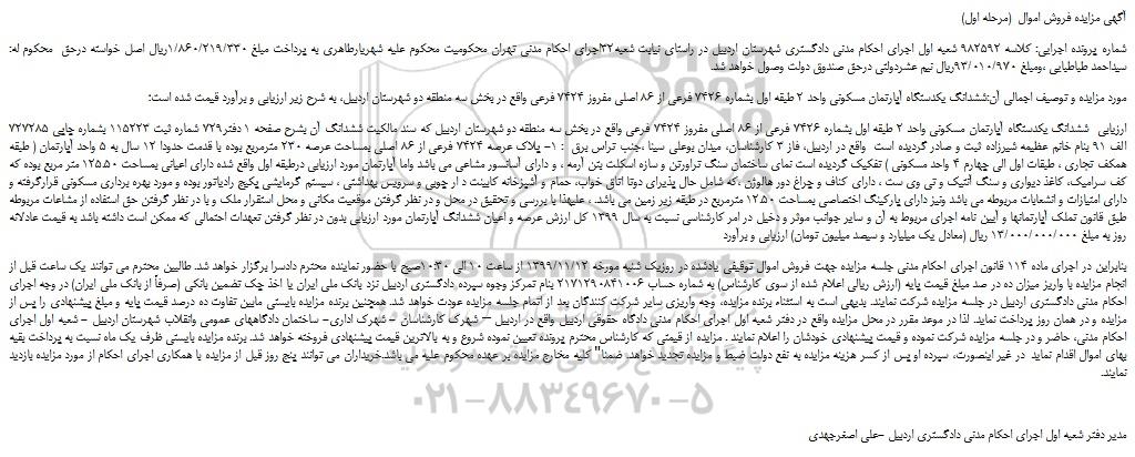 شماره پرونده اجرایی: کلاسه 982592 شعبه اول اجرای احکام مدنی دادگستری شهرستان اردبیل در راستای نیابت شعبه32اجرای احکام مدنی تهران محکومیت محکوم علیه شهریارطاهری به پرداخت مبلغ 1/860/219/330ریال اصل خواسته درحق محکوم له: سیداحمد طباطبایی ،ومبلغ 93/010/970ریال نیم عشردولتی درحق صندوق دولت وصول خواهد شد.