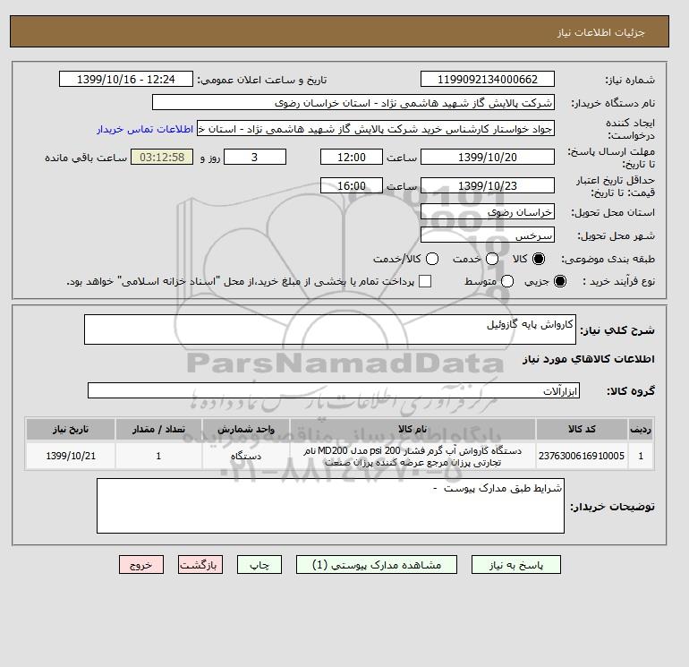 نام دستگاه خریدار:شرکت پالایش گاز شهید هاشمی نژاد - استان خراسان رضوی
