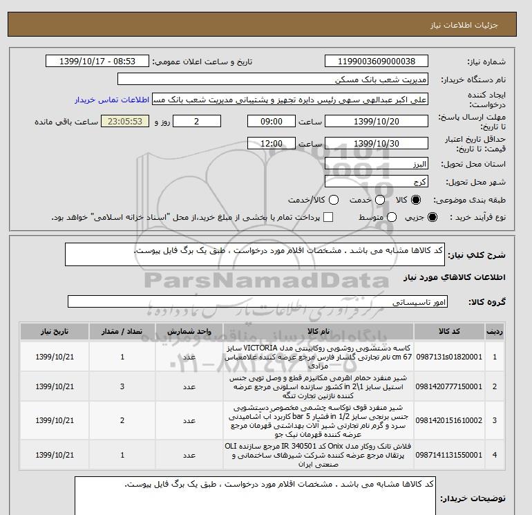 شرح کلی نیاز: کد کالاها مشابه می باشد . مشخصات اقلام مورد درخواست ، طبق یک برگ فایل پیوست.