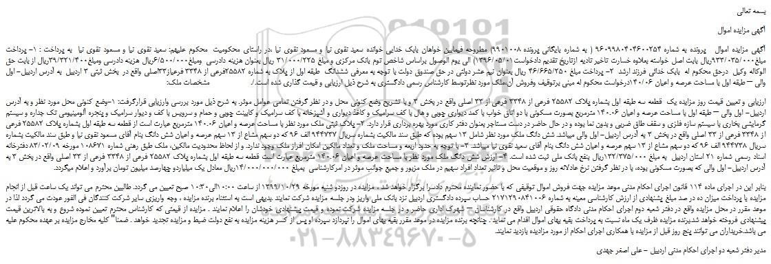 آگهی مزایده اموال پرونده به شماره 9609980404600254 ( به شماره بایگانی پرونده 9901008) مطروحه فیمابین خواهان بابک خدایی خوانده سعید نقوی نیا و مسعود نقوی نیا ،در راستای محکومیت محکوم علیهم: سعید نقوی نیا و مسعود نقوی نیا به پرداخت : 1- پرداخت مبلغ933/035/000ریال بابت اصل خواسته بعلاوه خسارت تاخیر تادیه ازتاریخ تقدیم دادخواست1396/05/01) الی یوم الوصول براساس شاخص توم بانک مرکزی و مبلغ 31/000/225 ریال بعنوان هزینه دادرسی ومبلغ6/500/000ریال هزینه دادرسی ومبلغ39/321/400ریال از بابت حق الوکاله وکیل درحق محکوم له بابک خدائی فرزند ارشد 2- پرداخت مبلغ 46/665/250 ریال بعنوان نیم عشر دولتی در حق صندوق دولت با توجه به معرفی ششدانگ طبقه اول از پلاک به شماره 25582فرعی از 3348 فرعیاز33اصلی واقع در بخش ثبتی 3 اردبیل به آدرس اردبیل- اول والی – طبقه اول با مساحت عرصه و اعیان 140/06درخواست محکوم له مبنی برتوقیف وفروش آن،ملک مورد نظرتوسط کارشناس رسمی دادگستری به شرح ذیل ارزیابی و قیمت گذاری شده است./. مشخصات ملک: