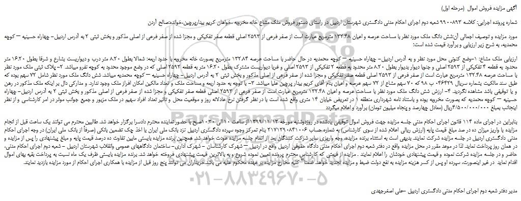 شماره پرونده اجرایی: کلاسه 9900893 شعبه دوم اجرای احکام مدنی دادگستری شهرستان اردبیل در راستای دستور فروش ملک مشاع خانه مخروبه ،خواهان کریم بیدارپرچین،خوانده:صالح آردن