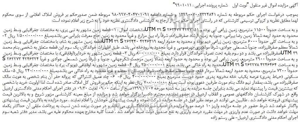 مشخصات اموال : 1- قطعه زمین مشهور به نبی یری، به مختصات جغرافیایی وسط زمین UTM 39 S 263477 4247151 و به مساحت حدوداً 11500 مترمربع، زمین زراعی آبی بوده و محدود به حدود اربعه شمالاً زمین رضا بیرامی، جنوباً به زمین ارشاد صفرقلیزاده، شرقاً راه بین مزارع و غرباً محدود به زمین حاج معرفت بایرامی می باشد.بمبلغ 1/500/000/000 ریال 2- قطعه زمین مشهور به شام، با مختصات جغرافیایی وسط زمین UTM 39 S 262440 4246319 و به مساحت کلی حدوداً 6000 مترمربع، زمین زراعی دیم بوده و محدود به حدود اربعه شمالاً معظم صفرقلیزاده، جنوباً شمسعلی جوادی، شرقاً موللایری-نهرعمومی و غرباً محدود به رودخانه می باشد. طبق اظهارات خواندگان، یک سوم این قطعه متعلق به شخصی بنام محمد صفرقلیزاده می باشد و دو سوم بقیه تحت تصرف خواندگان قرار دارد. بمبلغ 800/000/000 ریال 3- قطعه زمین مشهور به خردایر(اوقاباغی)، با مختصات جغرافیایی وسط زمین UTM 39 S 262273 4246324 و به مساحت حدوداً 2900 مترمربع، زمین زراعی آبی بوده و محدود به حدود اربعه شمالاً زمین مرحمت شکرجهانی، جنوباً و شرقاً زمین شمسعلی جوادی و غرباً محدود به راه خاکی می باشد. بمبلغ 350/000/000 ریال 4- قطعه زمین مشهور به اوقاباغی (بویوک یر)، با مختصات جغرافیایی وسط زمین UTM 39 S 262278 4246464 و به مساحت حدوداً 7300 مترمربع، محدود به حدود اربعه شمالاً سردار قانع، جنوباً معظم صفرقلیزاده، شرقاً قبرستان - معظم و غرباً محدود به راه خاکی می باشد.بمبلغ 240/000/000 ریال 5- ملک مسکونی (حیاط پدری) عرصه یکباب خانه مخروبه پدری حدود دویست مترمربع بمبلغ 400/000/000 ریال 6- 6- چاه عمیق اشتراکی که پروانه حفر آن بنام شخصی به هویت مالک صفرقلیزاده می باشد، بمقدار نیم دانگ بنام مورث طرفین دعوی بوده است بمبلغ 700/000/000 ریال نظر به اینکه حکم بر فروش کل املاک صادر شده است لذا اولویت خرید با شخصی که بیشترین قیمت را پیشنهاد نماید می باشد بنابراین جلسه مزایده به روز سه شنبه مورخه 1399/11/07صبح از ساعت 09:00 لغایت 09:30 در دفتر اجرای احکام مدنی دادگستری اردبیل واقع در شهرک کارشناسان دادگاههای عمومی و انقلاب اردبیل در حضور نماینده محترم دادسرا برگزار خواهد شد و مزایده از مبلغ معینه کارشناسی مزبور شروع و به بالاترین قیمت پیشنهادی فروخته خواهد شد . طالبین می توانند در موعد مقرر فوق در جلسه مزایده شرکت نموده و قیمت پیشنهادی خودشان را اعلام نمایند . مورد مزایده به بالاترین قیمت پیشنهادی واگذار خواهد شد شرط حضور در جلسه مزایده واریز 10 درصد مورد مزایده در حساب سپرده دادگستری می باشد و در صورت برنده شدن نسبت به پرداخت مابقی آن حداکثر یکماه مهلت خواهد داشت در صورت عدم واریزی در مهلت مقرره درصد واریزی به نفع صندوق دولت ضبط خواهد شد . ضمناً کلیه مخارج بعهده محکوم علیه می باشد. مدیر دفتر شعبه سوم اجرای احکام مدنی دادگستری اردبیل- علی رستم زاده