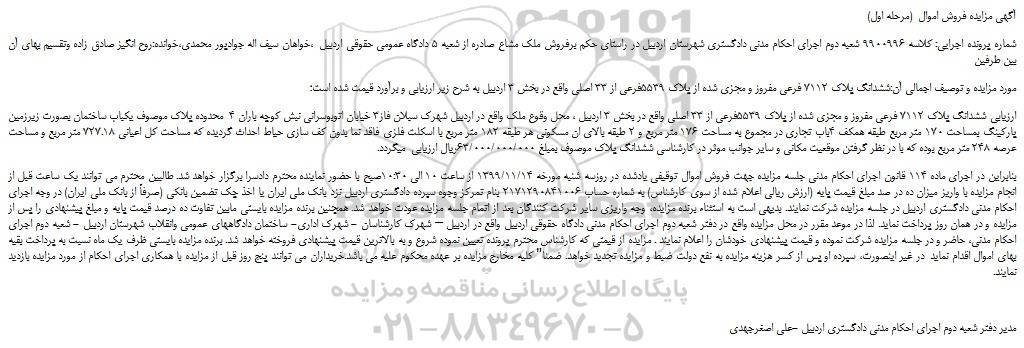 مورد مزایده و توصیف اجمالی آن:ششدانگ پلاک 7112 فرعی مفروز و مجزی شده از پلاک 5539فرعی از 33 اصلی واقع در بخش 3 اردبیل به شرح زیر ارزیابی و برآورد قیمت شده است؛