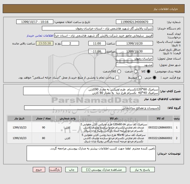 نام دستگاه خریدار:شرکت پالایش گاز شهید هاشمی نژاد - استان خراسان رضوی