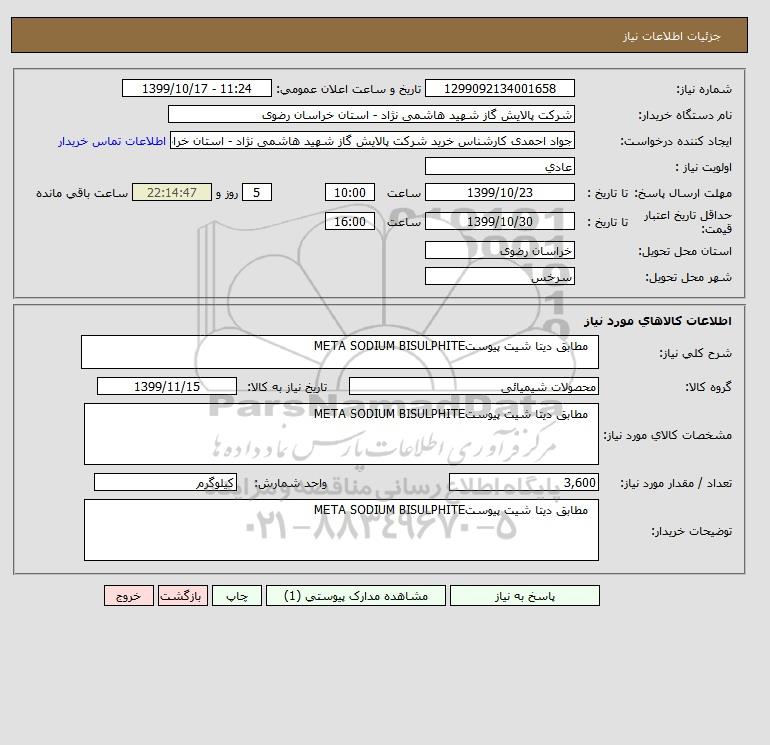 نام دستگاه خریدار:شرکت پالایش گاز شهید هاشمی نژاد - استان خراسان رضوی